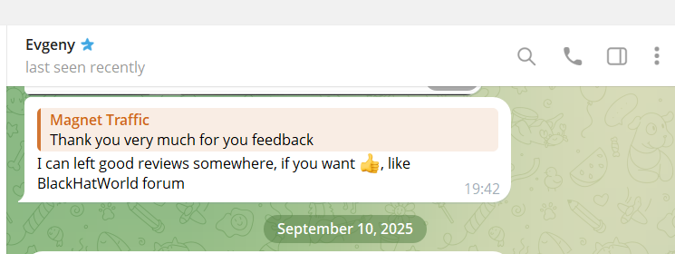 In the screenshot above, a user explicitly offers to leave a positive review on TrustPilot and BlackHatWorld.