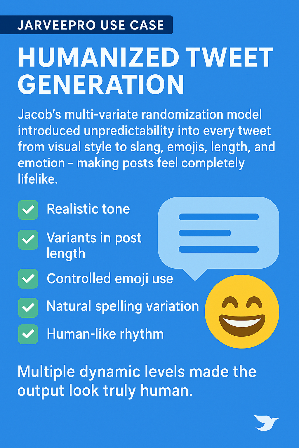 Jacob--a hands-on automation strategist who constantly experiments with JarveePro’s advanced Tweet AI. His recent results show that automation can look completely natural, if you understand how to control variables and randomness the right way.