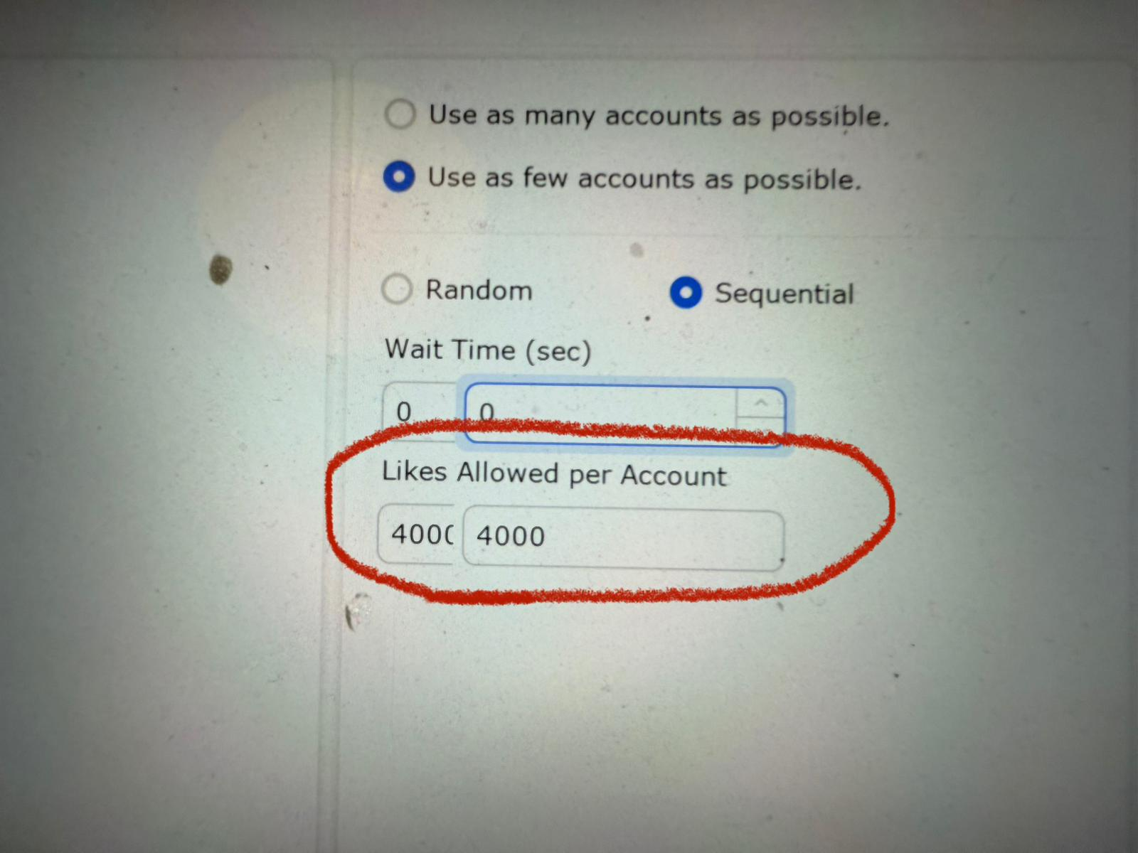 A1: This setting defines how many total likes each account will execute. For example, if it’s set to 4000, every account you run will attempt up to 4000 likes. It’s not a “list selector,” it’s an action quota.