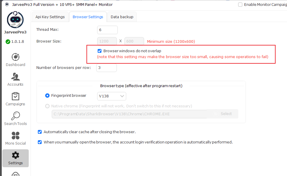 Server & RDP Usage: JarveePro works seamlessly on VPS or dedicated servers via remote desktop, provided the server has stable internet and sufficient RAM/CPU.