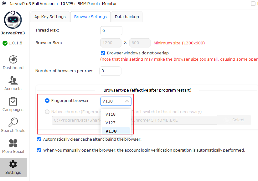 Added a setting to select fingerprint browser versions 138, 127, and 118.