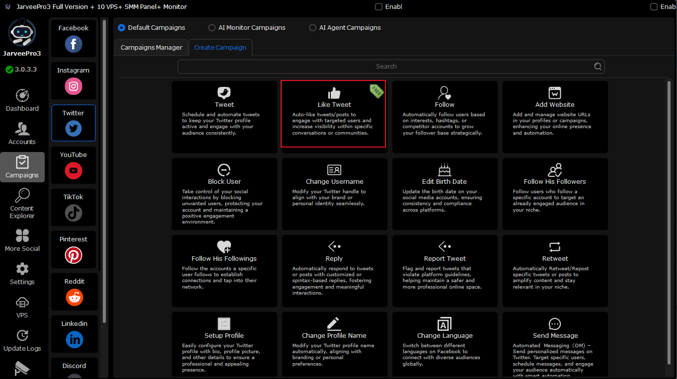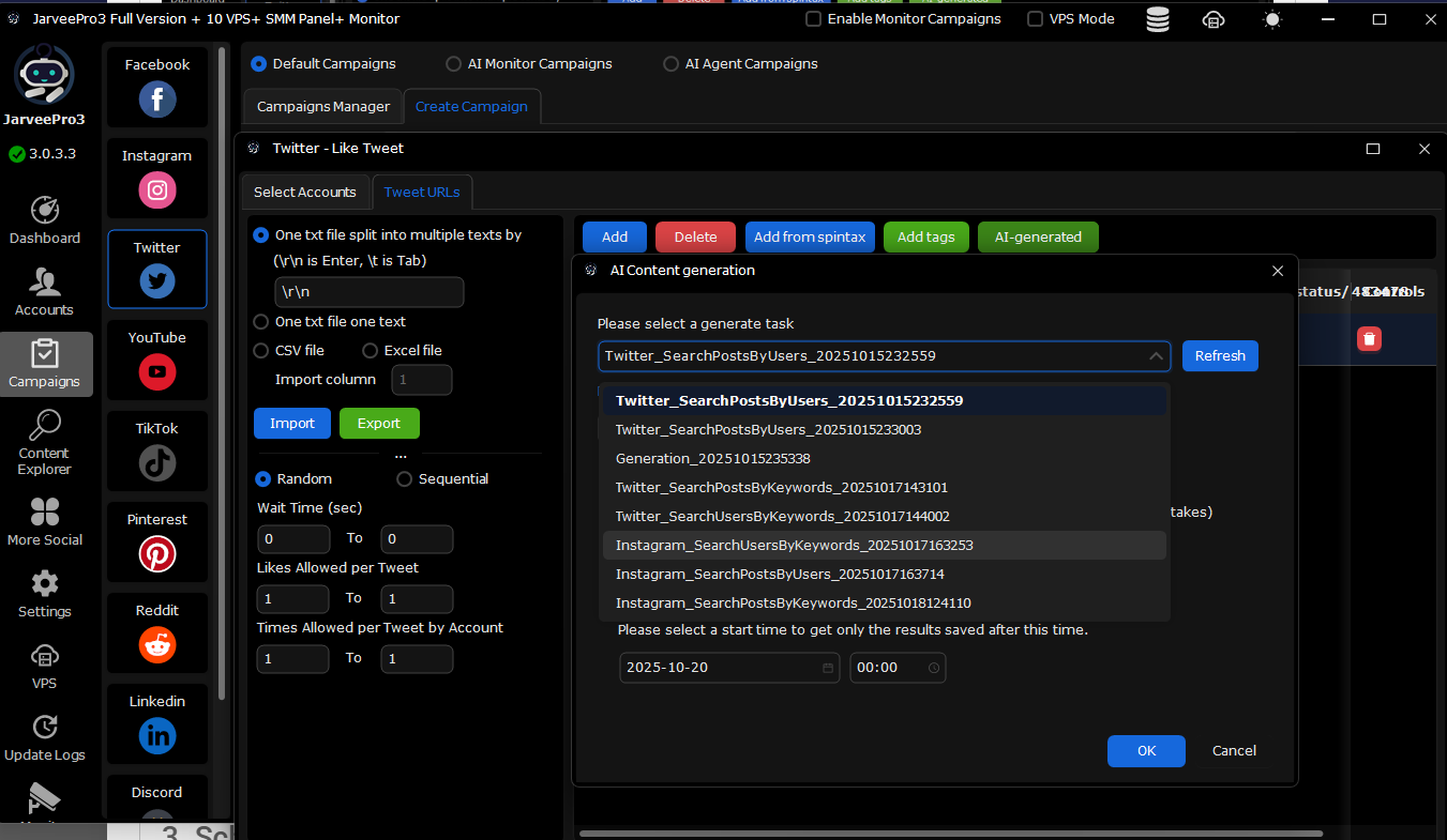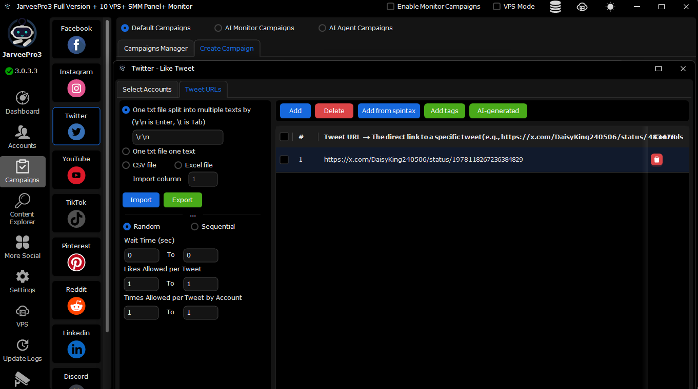 JarveePro’s Twitter Auto Like feature allows marketers to automate engagement by liking tweets from specific users, keywords, or AI-generated searches. You can add tweet links individually, import them from a local file, or use AI-generated links from previous search tasks. Best of all, this feature is completely free, making it easy for anyone to boost Twitter engagement without additional cost.